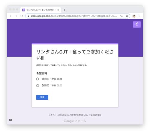 こんばんは。情シス(PCおじさん)の kadota です。 これは actindi Advent Calendar 2019、2日目の記事です。 12/2中に記事を出す予定でしたが、ぐずぐずしていたらすっかりこんな時間に…。こっそり記事をアップします。 adventar.org Googleフォームを使って…
